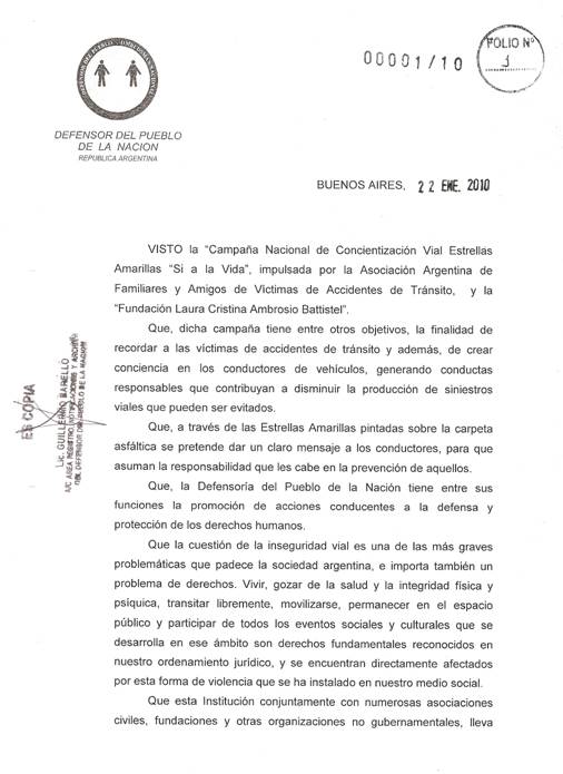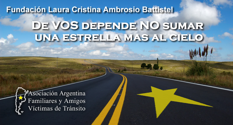 La Fundacion Laura Cristina Ambrosio Battistel y la Campaña Estrellas Amarillas dieron un paso más, es un mérito de todos los que conformamos esta gran familia que día a día se va agrandando en pos de darle dura batalla a este flagelo, haber sido reconocida por la Legislatura de la Ciudad Autónoma de Buenos Aires declarándola de "Interés Social". Tengo la más absoluta convicción que este año con esfuerzo y con el corazón vamos hacer entrar en razón a quienes no quieren escuchar, a quienes no quieren entender la gravedad de este flagelo que en el año 2009 dejo en Córdoba 522 muertes, 1566 incapacitados permanetes, 39.150 incapacitados transitorios, 62.640 internados y 261.000 lesionados (Información LA VOZ DEL INTERIOR- 2 de Enero 2010) Estas cifras son aterradoras, vamos entre todos a redoblar los esfuerzos y derrotar a este enemigo Social que tiene en vilo a todo la sociedad. Sabemos que podemos y lo vamos hacer. Un abrazo Julio Ambrosio