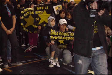 familiares de víctimas con banderas. Llegaron